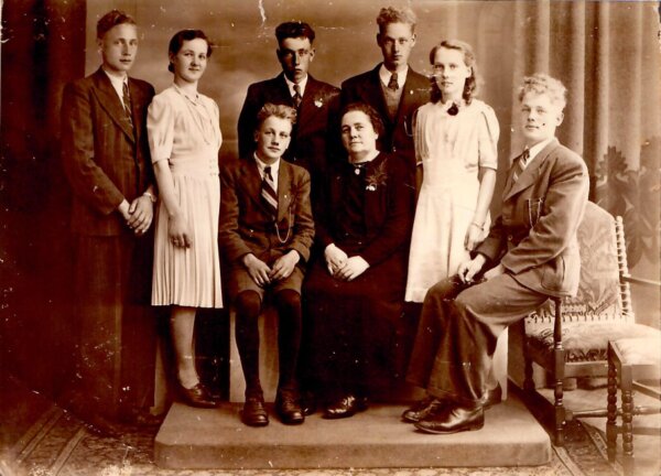 Het gezin Ouwerkerk. Van links naar rechts: Bas, Rie, Arie, Toon. Moeder Kee, Piet, Corrie en Kees.