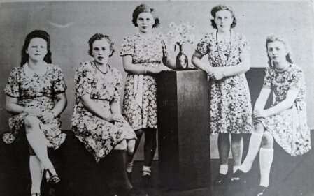 op de achtergrond bij de foto van Mien met haar drie zussen ziet, werd