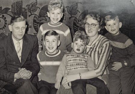 gezin van Sijb en Marie 1959 van links naar rechts Sijb, Paul en Jan, Ries, Marie en Wim.